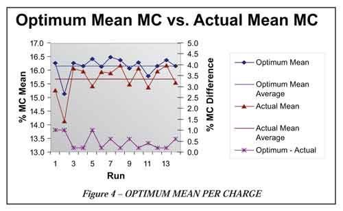 But there is a further complication in that the optimum mean MC pull target changes with seasonal variations and changes in log diets. So, if one is to use a target mean MC value for “pulling” a charge, one must be constantly looking for these long-term variances and adjust accordingly. The answer is to not track the resultant mean MC, but to track the optimum value against the actual value for each charge and to determine how much each charge was either over dried or under dried. By tracking this parameter, one can use this as their process mean in an SPC control chart. Seasonal log diet changes and other more long-term variability drifts will be readily evident in such a control chart. These charts will automatically provide the necessary information to feedback to the kiln operator for adjusting the “pull” target. This methodology is outlined in the following section.